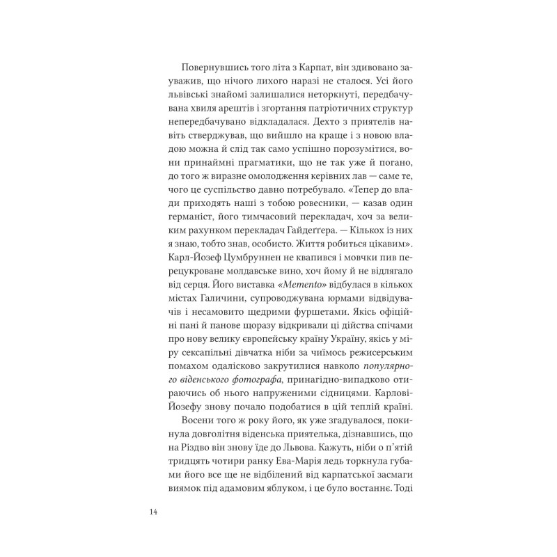 Анотація: Австрійський фотограф Карл-Йозеф Цумбруннен приїжджає до України, щоб віднайти себе і своє призначення. В химерній мандрівці його супроводжують перекладачка Рома Воронич із майже дорослою донькою й чоловіком-поетом, професор Доктор, дві стриптизерки та режисер — постановник відеокліпів. Прибувши до вельми дивного карпатського готелю — колишньої метеостанції, — товариство опиняється на межі містичного потойбіччя.