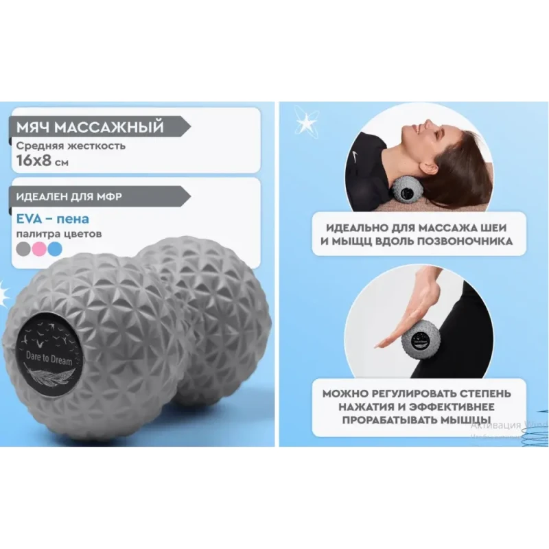 Подвійний масажний м'яч – відмінний додаток до ролика, що допомагає розм'якшити м'язи, покращити кровообіг і зняти напругу. Підходить як для тренувань фітнесу, так і для йоги, сприяє зміцненню м'язів та підвищенню гнучкості.