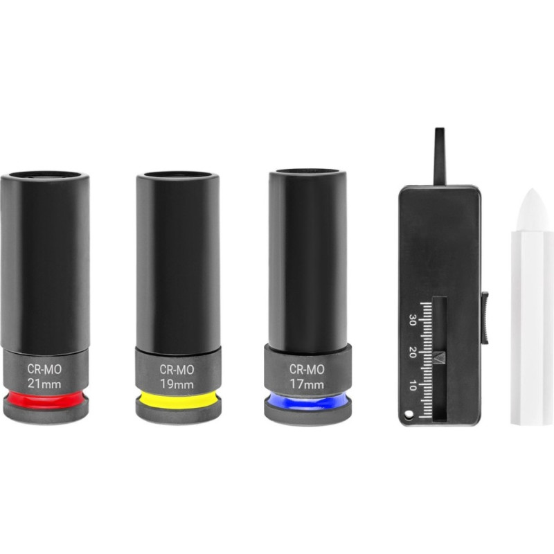 Набір Einhell із 3 ударних торцевих головок 1/2" завдовжки 80 мм у розмірах 17, 19 та 21 мм виготовлений із хроммолібденової сталі з марганцево-фосфатним покриттям для роботи з ударними гайковертами з високим крутним моментом. Пластикова втулка захищає легкосплавні диски від подряпин під час заміни коліс. У комплекті — крейда для шин і вимірювач глибини протектора, усе зберігається в кейсі M-CASE з EVA-вставкою карбонового дизайну.