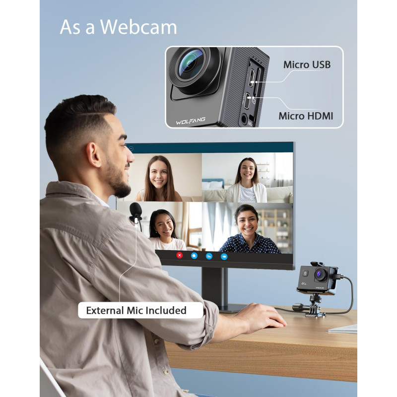 Камера має легкий і компактний дизайн, її зручно брати з собою куди завгодно. Разом з різноманітними кріпленнями, які входять у комплект, WOLFANG GA100 стане незамінним супутником для зйомки на велосипеді, мотоциклі, шоломі чи навіть під водою.