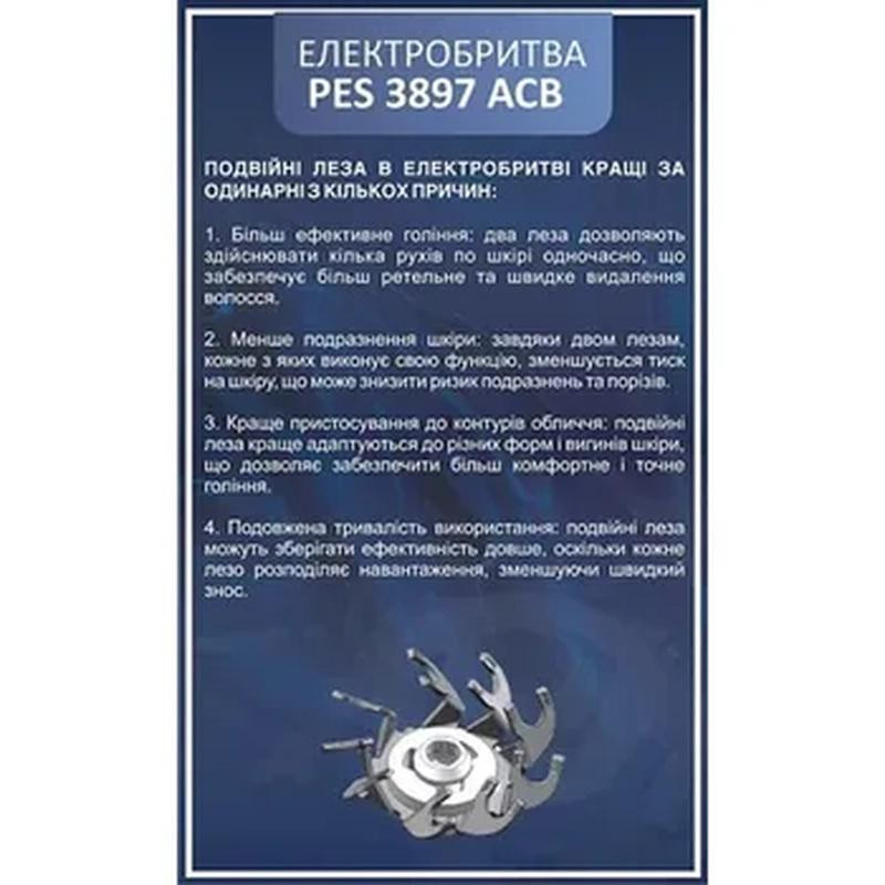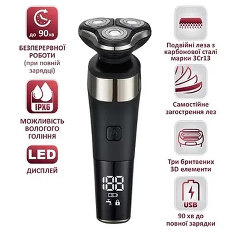 | Додатково | Самозагострювальні леза. Подвійні леза із карбонової сталі. Підсвічування дисплея. Захист від води: IPX-6. Зарядний кабель USB типу C. |