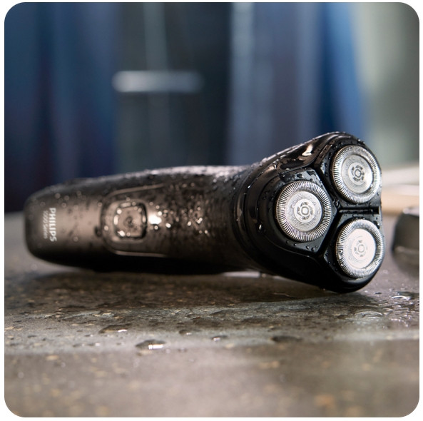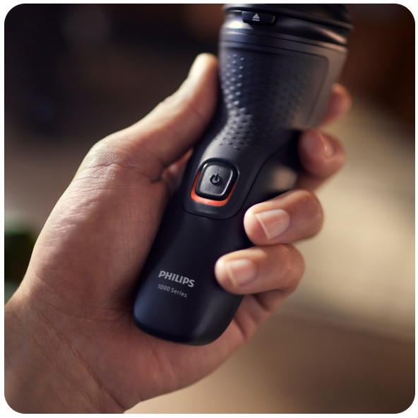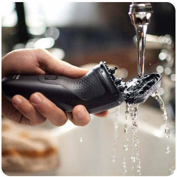 Голівка бритви відкривається одним натисканням кнопки, для очищення проточною водою.