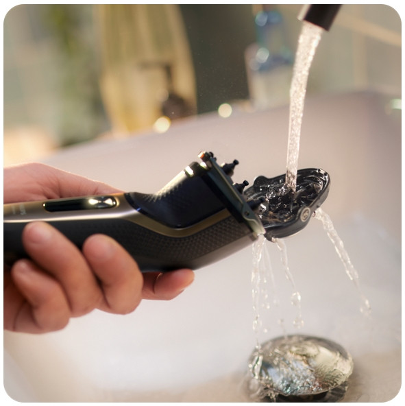 Голівка бритви відкривається одним натисканням кнопки, для очищення проточною водою.