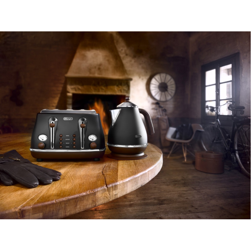 Електрочайник Delonghi KBOV 2001.BK дизайнерської серії Vintage Icona стане прикрасою вашої кухні. Незвичайна, пінгвінообразна форма виглядає витончено і привабливо. Прилад прикрасить вашу кухню і буде довго радувати погляд. Прикрашений в нижній частині вузьким хромованим пояском.