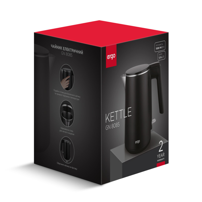 Завдяки корпусу з подвійними стінками модель ERGO GN 8085 має властивості термоса, тож після нагрівання води її температура зберігається тривалу годину. Крім того, чайник з підвійними стінками більш безпечний, адже захищає користувачів від опіків.
