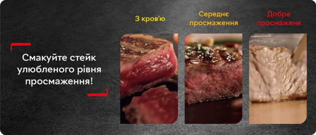 Завжди отримуйте соковитий стейк з ідеальним просмаженням як від шеф-кухаря. Обирайте м'ясо та бажаний ступінь прожарювання. Все інше гриль зробить сам.
