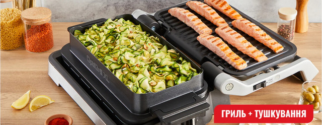 Приготуйте повноцінну вечерю витрачаючи мінімум часу та зусиль. Відкрийте гриль на 180 градусів для смаження основної страви, та одночасно використовуйте форму для випікання для приготування гарніру. Змінюйте температуру приготування на 4х позиційному термостаті що розташований знизу, та насолоджуйтеся вечерею з OptiGrill.