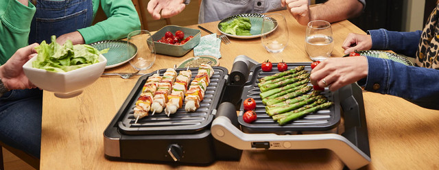 Отримайте більшу площу для приготування та влаштуйте барбекю прямо посеред стола. При відкриванні грилю на 180С, 4х позиційний термостат підтримує однакову температуру з обох сторін. Перетворіть вечерю з друзями на цікаву та смачну розвагу.