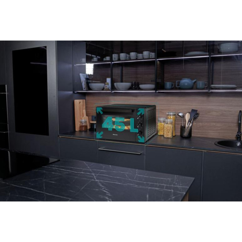 Мінідухівка Hisense може легко замінити повнорозмірну духовку на невеликій кухні. Ви можете повністю адаптувати використання до своїх потреб, вибравши з-поміж п'яти різних комбінацій режимів нагрівання (нагрівання верхньої або нижньої зони в поєднанні з конвекцією або грилем), встановивши температуру від 90 до 220 ℃ та годину до 60 хвилин.