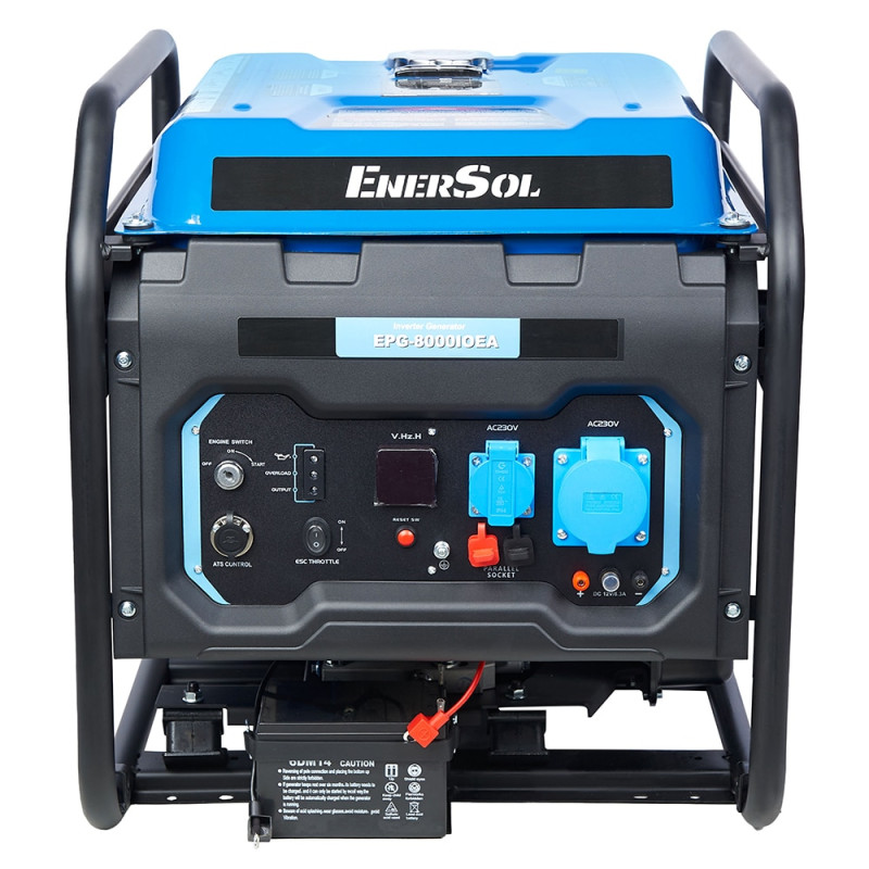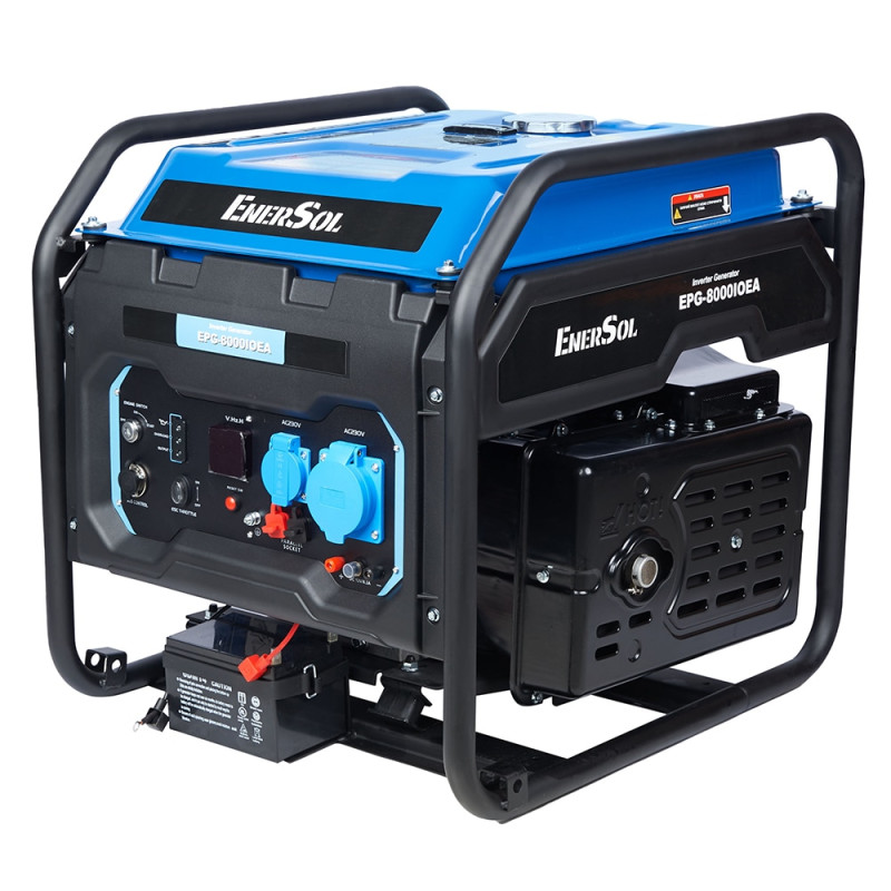 EnerSol EPG-8000IOEA генерує однофазне електропостачання 230 В з частотою 50 Гц, номінальною потужністю 7 кВт та максимальною 8 кВт. Інверторна конструкція формує чисту синусоїдальну хвилю для захисту чутливих пристроїв від колівань. Двигун GP460 чотиритактний з одним циліндром об'ємом 460 см³ та потужністю 12,68 кВт обертається на 3000 об/хв, бак вміщує 25 л бензину з витратою 0,35 л/кВт·год. Рама зі сталі вагою 70 кг у габаритах 440x380x460 мм полегшує фіксацію, електростартер із ручним дублюванням спрощує запуск.