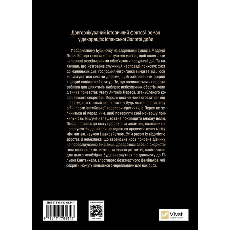 Анотація: У задрипаному будиночку на задрипаній вулиці в Мадриді Люсія Котадо тихцем користується магією, щоб полегшити наповнені нескінченними обов’язками посудниці дні. Та виявивши, що незграбна служниця насправді приховує хист до маленьких див, господиня-інтриганка вимагає від Люсії користуватися своїми дарами, щоб забезпечити родині кращий соціальний статус. Те, що починається як проста забавка для шляхтичів, набирає небезпечних обертів, коли дівчина привертає увагу Антоніо Переса, зганьбленого королівського секретаря. Король досі не може оговтатися від поразки, тож готовий скористатися будь-якою перевагою у війні проти англійської королеви-єретички; а Перес не зупиниться ні перед чим, щоб повернути собі монаршу прихильність. Рішуче налаштована покращити власну долю, Люсія поринає до світу пророків та алхіміків, святенників і спекулянтів, де ніколи не вдається провести точну межу між магією, наукою і шахрайством. Утім разом із відомістю зростає й небезпека, що єврейська кров прирече дівчину на переслідування Інквізиції. Доведеться сповна скористатися власною кмітливістю та волею до життя, навіть якщо для цього необхідно буде звернутися по допомогу до Гільєна Сантанхеля, злостивого безсмертного фамільяра, чиї секрети можуть виявитися смертельними для них обох.