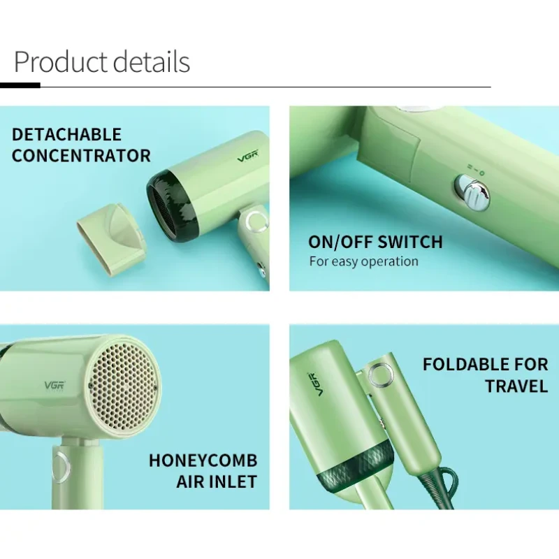 Компактний складний фен, який швидко та ефективно висушить волосся. У моделі VGR V-421