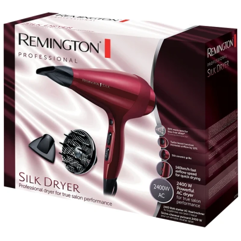 - Фен Remington AC9096 з колекції Silk оснащений потужним двигуном потужністю 2400 Ватт, що забезпечує високу швидкість повітря до 110 км/год.
