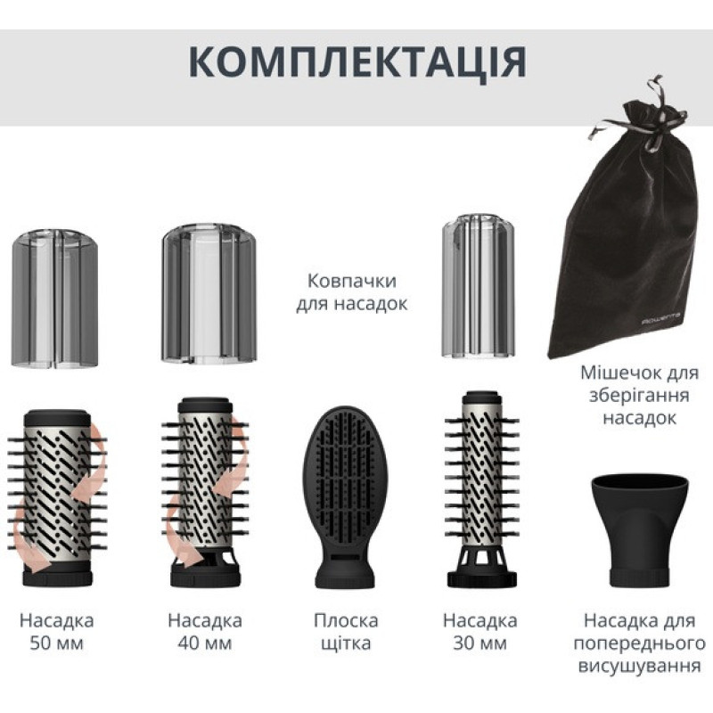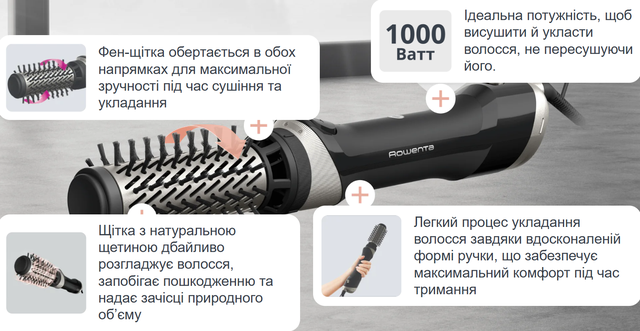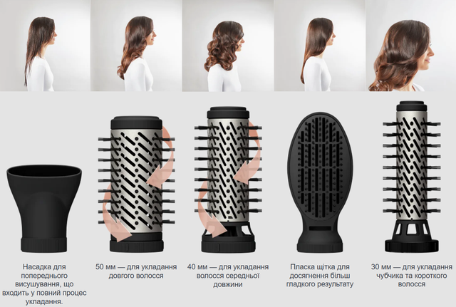 Три щітки, що входять у комплект, дають змогу укладати волосся будь-якого типу: пряме, хвилясте та кучеряве, незалежно від його густоти та довжини.