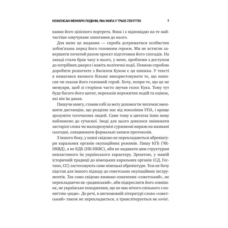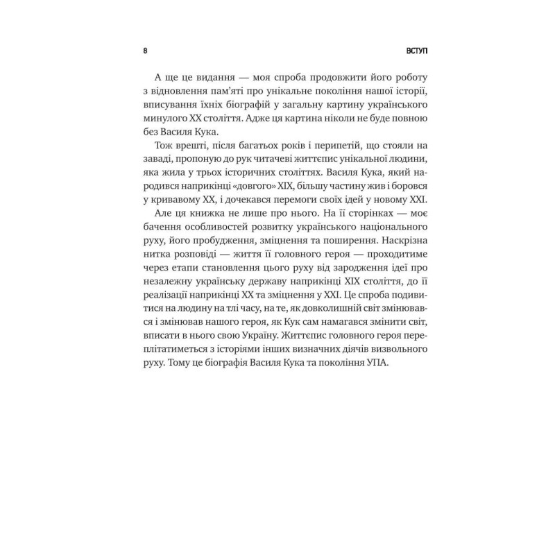 Боротьба українських підпільників проти польської влади, спроба відновлення незалежності в 1941-му, розгортання мережі ОУН на півдні та сході України, протистояння нацистському режиму, найбільший бій УПА під Гурбами весною 1944 року, війна повстанців проти совєтської влади, репресії та провокації НКВД, спроби КҐБ ламати непокірних в’язнів і врешті розвал совєтської імперії — це все розділи біографії Кука. Але ця книжка — не лише життєпис непересічної постаті, а й масштабне дослідження українського національного руху: від його зародження в ХІХ столітті до збройного спротиву проти нацистів і совєтів, і до перших років незалежної України.
