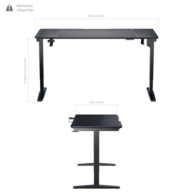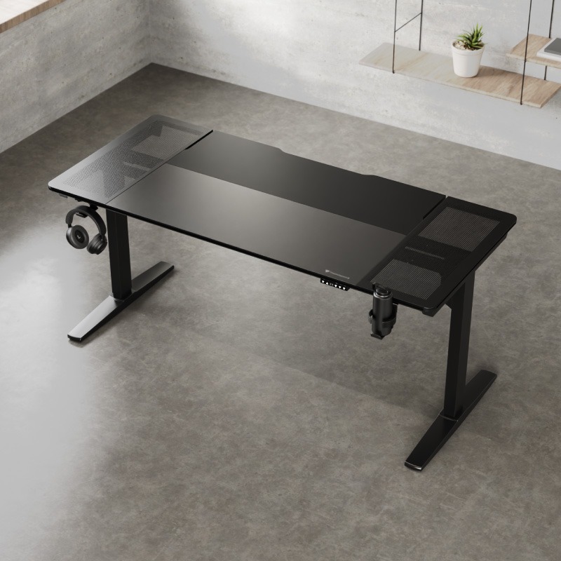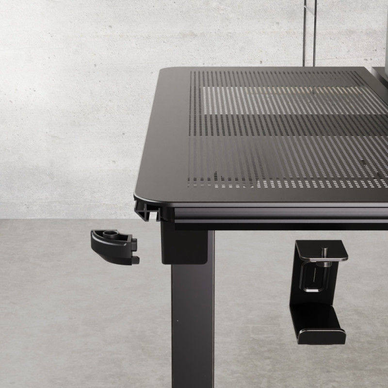Ергономічний стіл LAB-X має стільницю розміром 170 x 75 см із моторизованим регулюванням висоти від 75 до 120 см для плавних і безшумних переходів. Його автоматичне опускання, що запобігає зіткненням, забезпечує безпеку, а сітчаста бічна панель покращує забір повітря для ПК. Завдяки алюмінієвій рамі цей стіл поєднує функціональність та гнучкість, створюючи ідеальну робочу станцію для ігор, роботи, навчання тощо.
