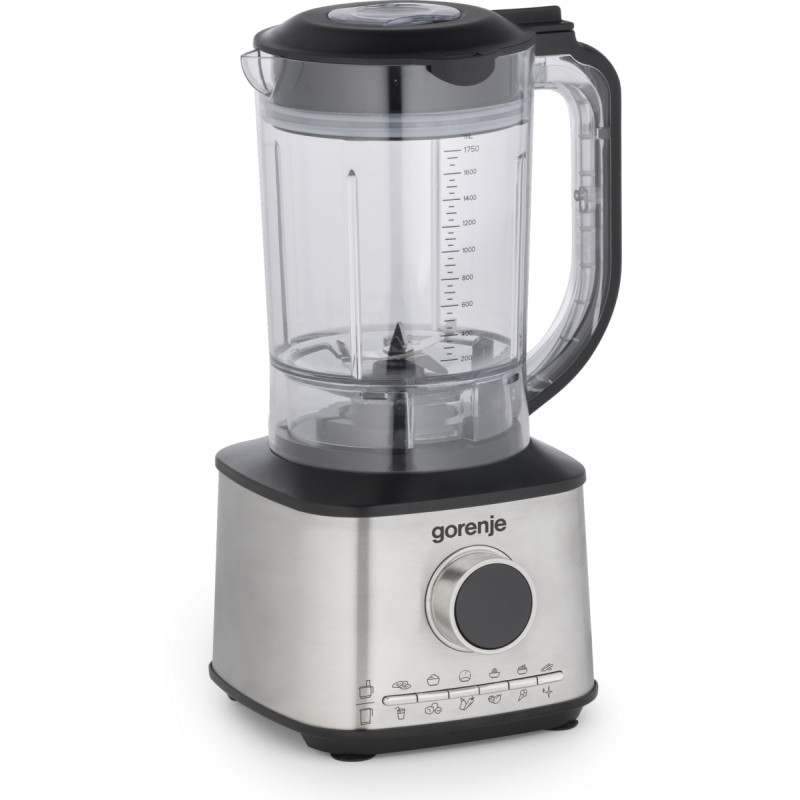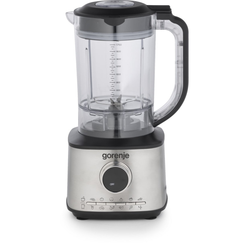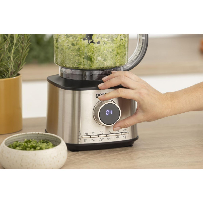 Кухонний комбайн Gorenje 2-в-1 з Fusion Mode: комбайн і блендер в одному, 12 автопрограм (6 кнопок) та 10-швидкісний регулятор. AC-двигун 1500 Вт, чаша 2,0 л, глечик 1,75 л, LED-дисплей. Повний набір насадок, знімні деталі придатні для миття в посудомийці, є блокування та захист від перегріву.