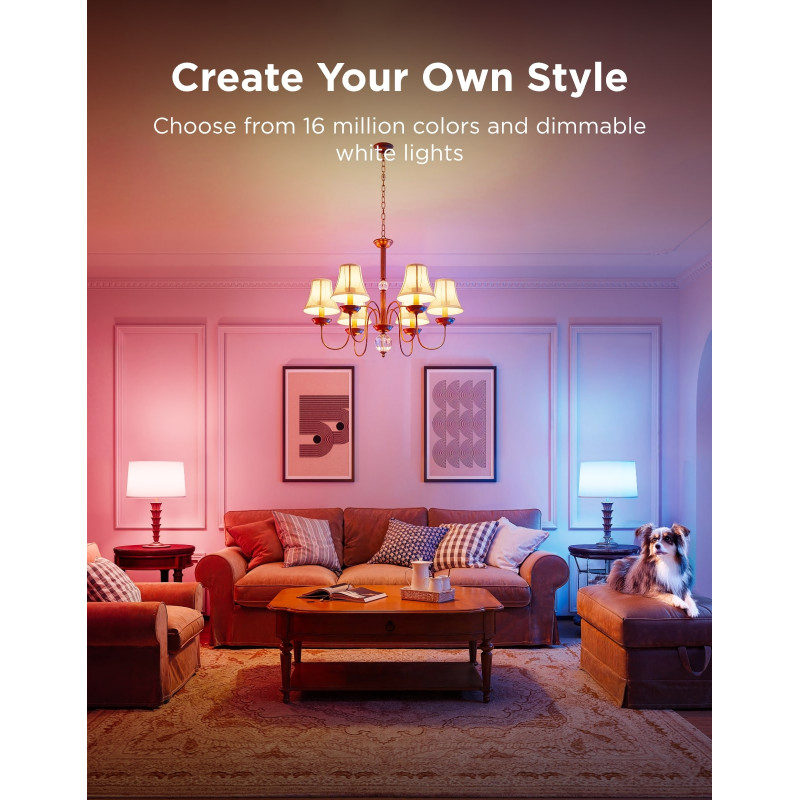 Розумна лампа Govee H600C E14 допомагає створювати різні настрої завдяки мільйонам кольорів та змінній температурі світла. Вона підтримує керування через Wi-Fi та Bluetooth, реагує на музыку та сумісна з популярними голосовими помічниками. Модель забезпечує комфортне освітлення з яскравістю до 450 лм та працює всього від 5 Вт. Це чудове рішення для атмосфери у будинку, від спокійного відпочинку до яскравих кольорових сцен.
