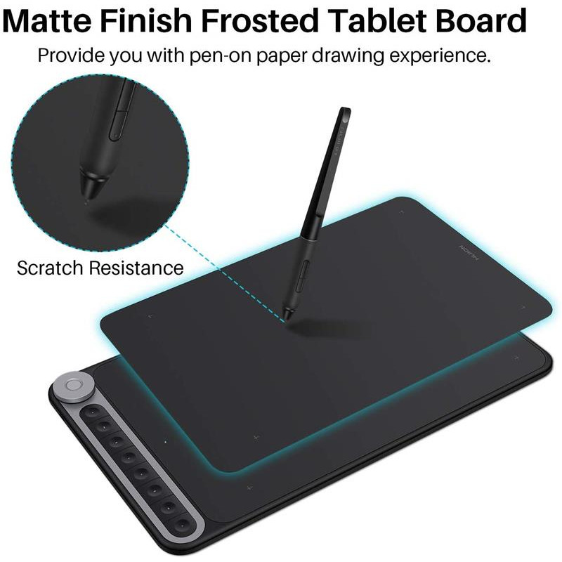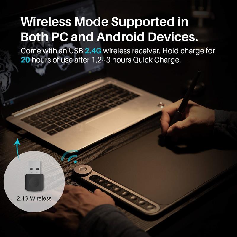 Крім унікального засобу управління, новий планшет оснащений і багатьма іншими функціями, здатними ефективно задовольняти потреби користувачів. Частота опитування на рівні 266PPS забезпечує можливість креслити і малювати без затримок і прирівняних ліній незалежно від вашої швидкості - планшет миттєво вловлює кожен рух пера. 8192 рівня чутливості до тиску дозволяє здійснювати природний рендеринг кожної лінії за рахунок різного тиску на поверхню планшета при введенні штрихів різної товщини. Крім того, поєднання можливостей бездротового зв’язку і 20-годинної роботи від акумулятора не тільки звільняє користувачів від необхідності в численних кабелях, а й забезпечує додаткову зручність творчості - тепер ви не пропустіть жоден момент натхнення. На відміну від інших цифрових продуктів, що нагадують про необхідність заміни тільки коли батарея майже під кінець, світлові індикатори клавіш нового планшета відображають рівень заряду в режимі реального часу, що дозволить вам працювати на відкритому повітрі, не турбуючись про акумулятор.