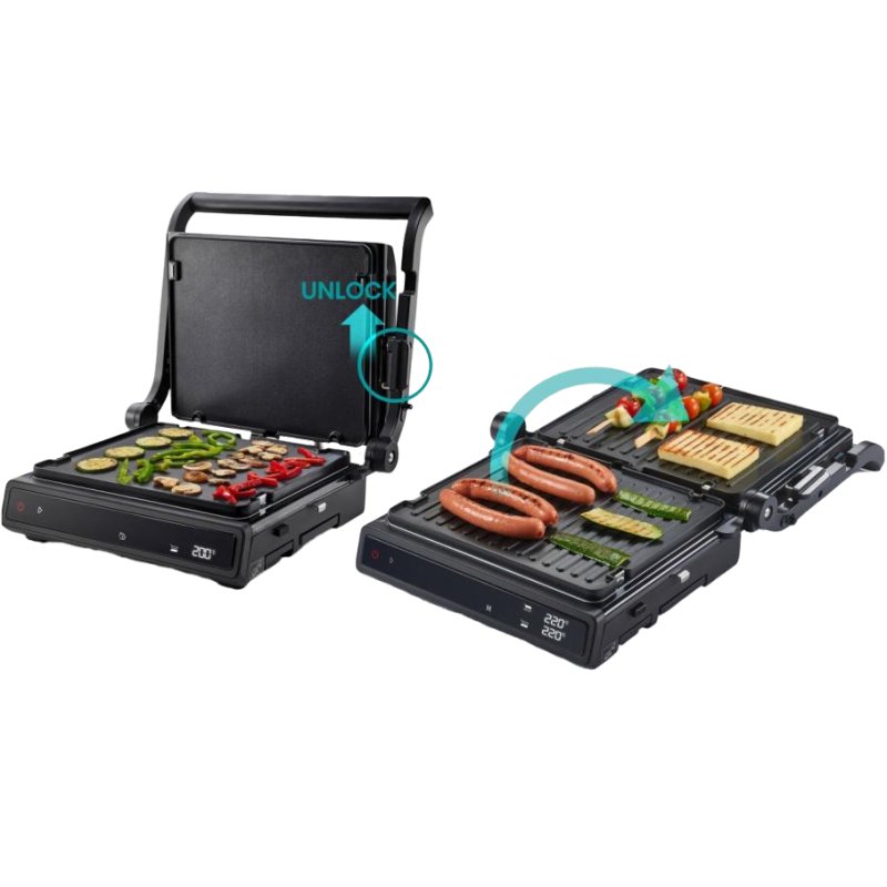 Пластини гриля не тільки знімні та реверсивні, а й на кожній з них можна встановити індивідуальну температуру, що дає змогу готувати різні види їжі одночасно. Наприклад, ви можете легко приготувати основну страву та гарнір одночасно. Температуру можна встановити в діапазоні від 80 °C до 230 °C, а правильну температуру для шкірного типу продуктів ви знайдете в посібнику доданого користувача.