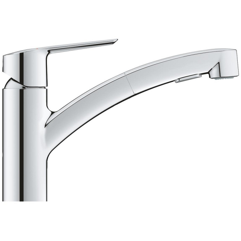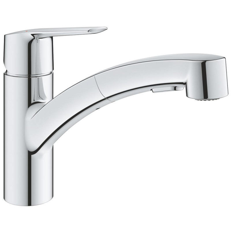 Grohe Start — кухонний змішувач із поворотним та витяжним виливом завдовжки 227 мм та зручним одноважільним керуванням. Хромоване покриття надає сучасного вигляду та захищає поверхню від зношування.