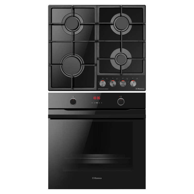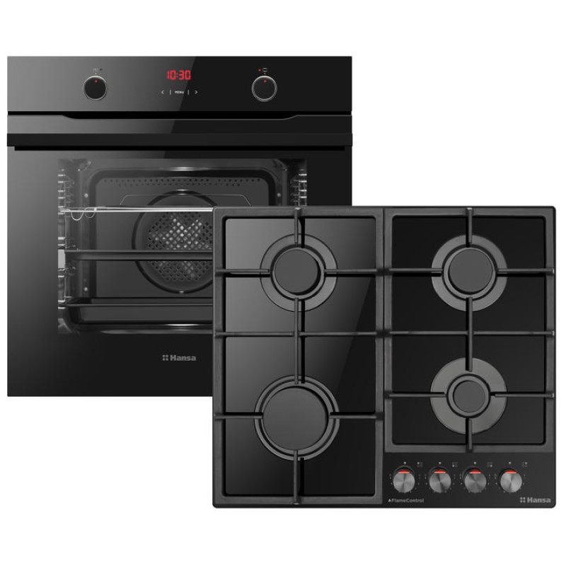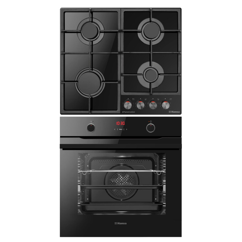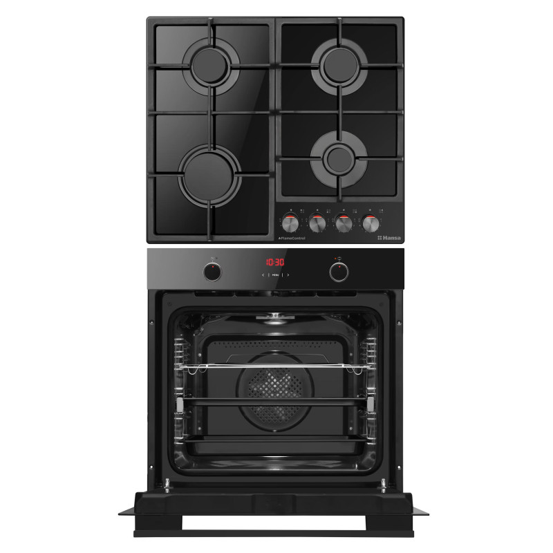 Комплект Hansa FCGS69326 поєднує електричну духовку об'ємом 77 л із 9 режимами приготування та газову варильну поверхню на склі з чотирма конфорками Somipress. Духовка оснащена паровим очищенням, сенсорним та механічним керуванням, телескопічними напрямними та галогенним підсвічуванням. Варильна поверхня має чавунні решітки, електрозапалювання в ручках і захист від загасання пламени.