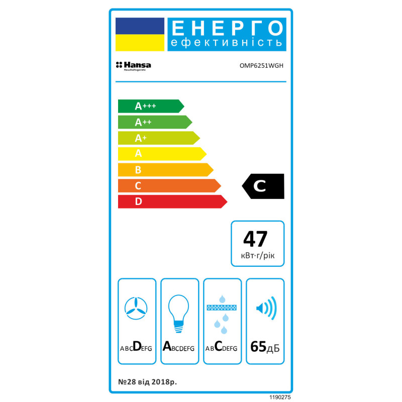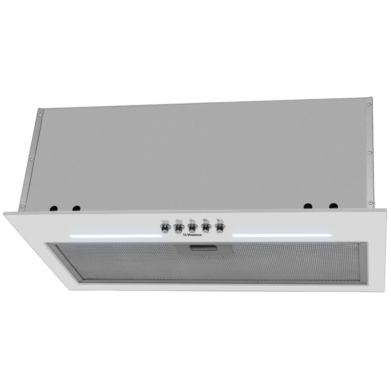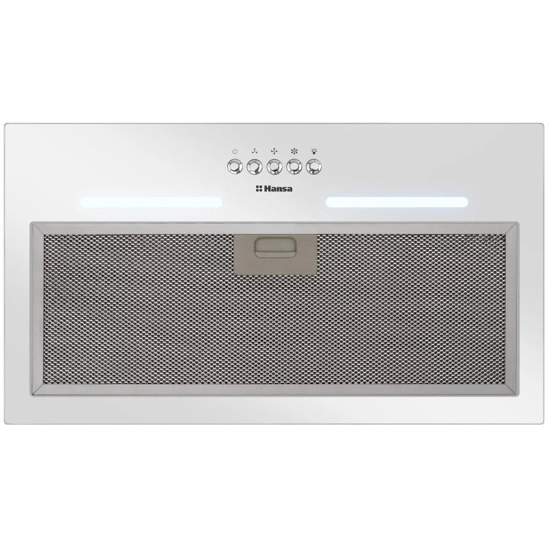 Вбудована картриджна витяжка Hansa OMP6251WGH шириною 55 см призначена для монтажу всередині кухонних шаф. Максимальна продуктивність становить 389 м³/год, що дозволяє швидко видаляти пари та запахи під час приготування. Три швидкості роботи дають змогу точно регулювати інтенсивність вентиляції, а світлодіодна стрічка забезпечує рівномірне холодне освітлення робочої зони. Кнопкове керування розміщене на одній стороні панелі.