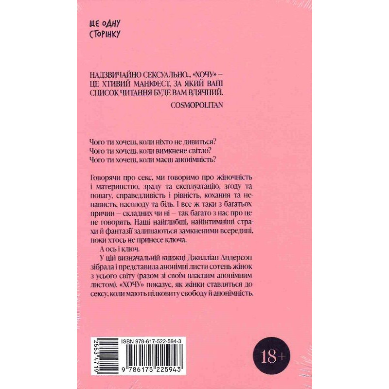 У цій визначальній для покоління книжці Джилліан Андерсон зібрала і представила анонімні листи сотень жінок з усього світу (разом зі своїм власним анонімним листом). «ХОЧУ» показує, як жінки ставляться до сексу, коли мають цілковиту свободу й анонімність.