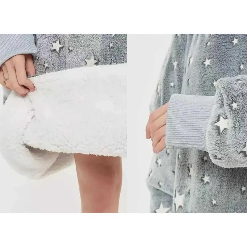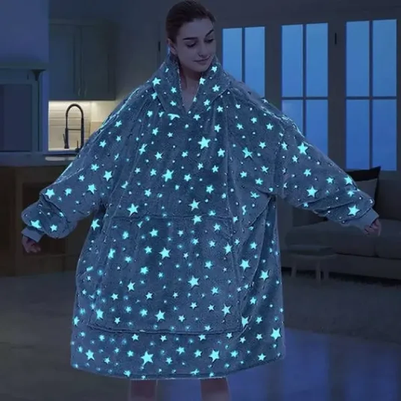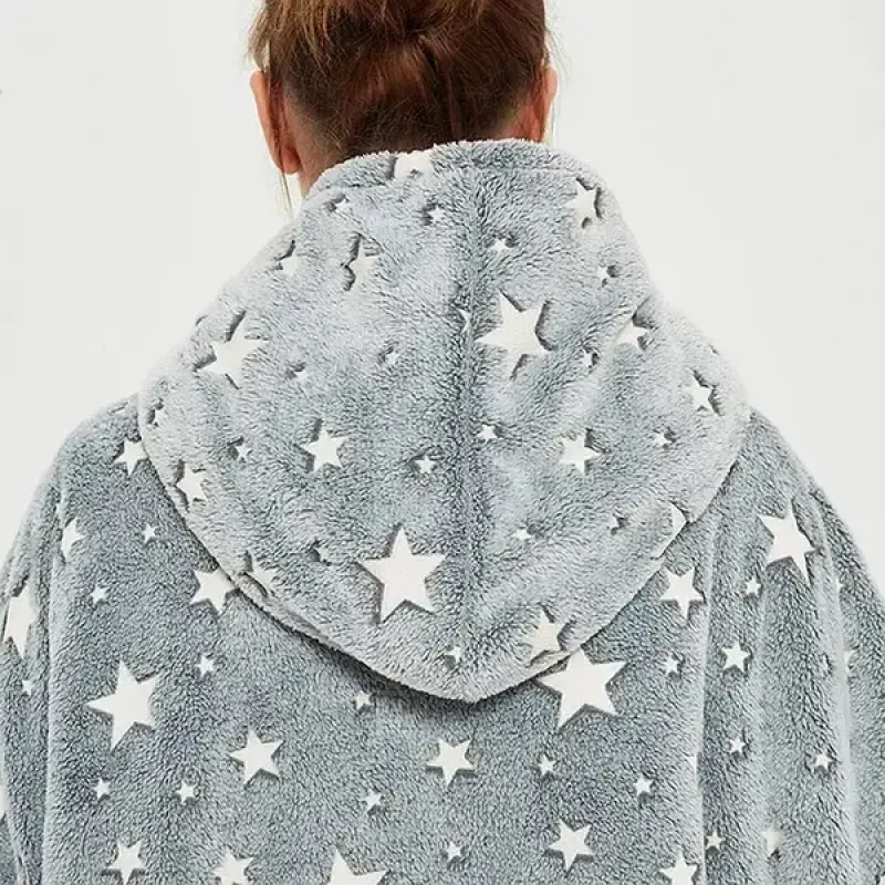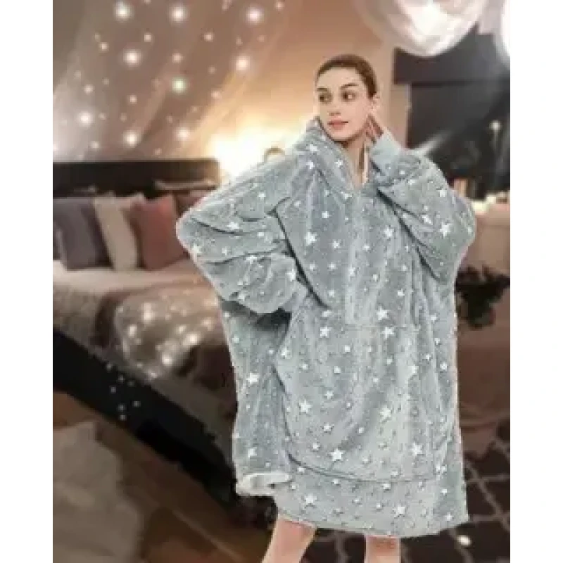 Толстовка з капюшоном - це самий затишний і комфортний костюм з капюшоном, що поєднує в собі велику толстовку і тепле одеяло. Толстовка-плед зшита з ультрам'якого флісу, має один великий розмір, щоб максимально вкрити з голови до ніг. У толстовці є одна містка кишеня, щоб тримати під рукою все необхідне. Її розмір лише один, і він дуже великий. Візьміть її з собою в похід або просто розслабтеся вдома за переглядом улюблених фільмів - вона ідеально підійде як для одного, так і іншого. Але найголовнішою особливістю цієї кофти є зірочки, що світяться на кофті. Вони світяться завдяки вишивці спеціальними нитками. Ось світла тканина накопичує світло і в темряві починає світитися. Толстовка з капюшоном стане комфортним та приємним містечком для зимових днів. Порадуйте себе та своїх близьких таким приємним подарунком.