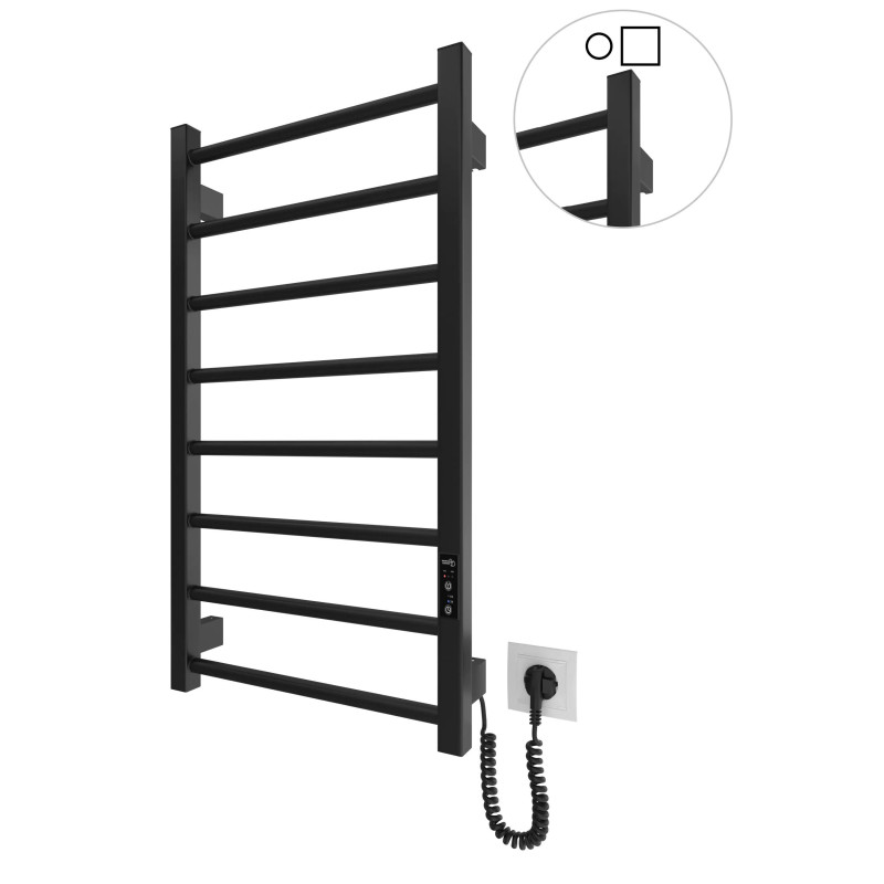 Електрична рушникосушарка HF Leeds 770×430. Працює за технологією сухого ТЕНу. Обладнана вбудованим таймер-регулятором і конектором для підключення до живлення з будь-якого боку. Оснащена комплектом для прихованого підключення.