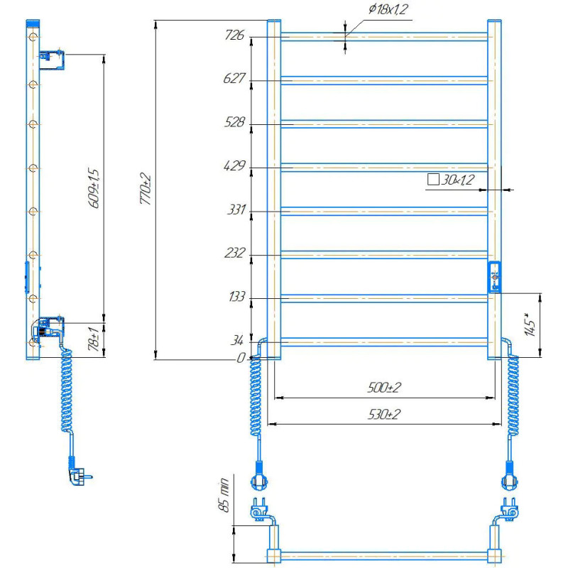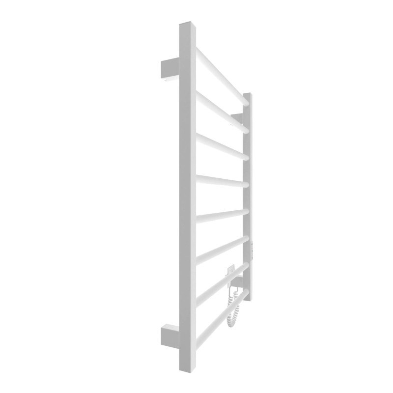 Електричний рушникосушарка HF Leeds 770×530. Працює за технологією сухого ТЕНу. Обладнана вбудованим таймер-регулятором та конектором для підключення до живлення з будь-якого боку.