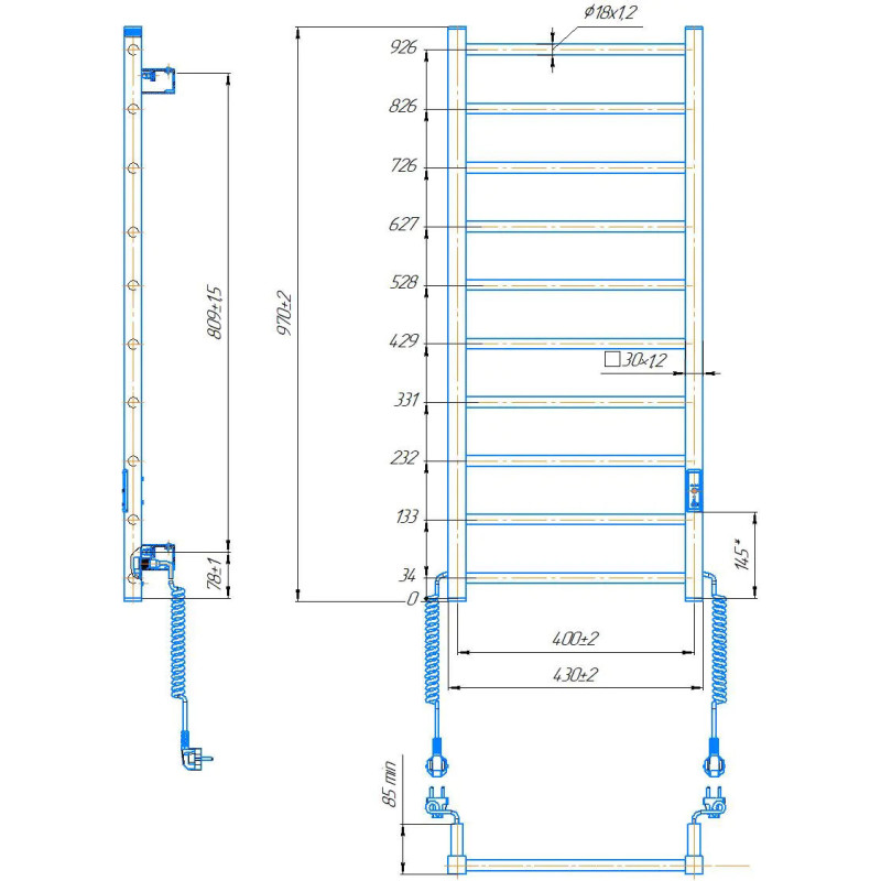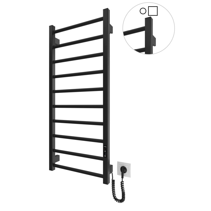 Електрична рушникосушарка HF Leeds 970×430. Працює за технологією сухого ТЕНу. Обладнана вбудованим таймер-регулятором і конектором для підключення до живлення з будь-якого боку. Оснащена комплектом для прихованого підключення.