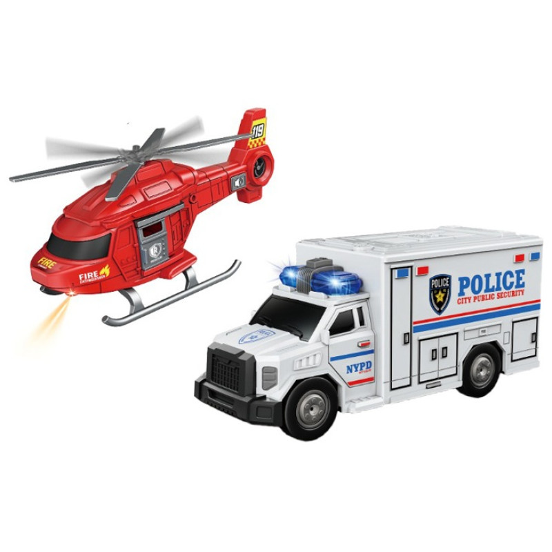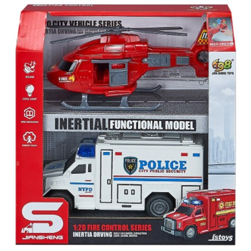 Набір машинок: Поліцейська вантажівка та пожежний гелікоптер 1:20, лопасті гелікоптрера крутяться (інерція, звук, свіло). Живлення: 3 батарейки типу AG13 (у комплекті). Упаковка: відкрита коробка.