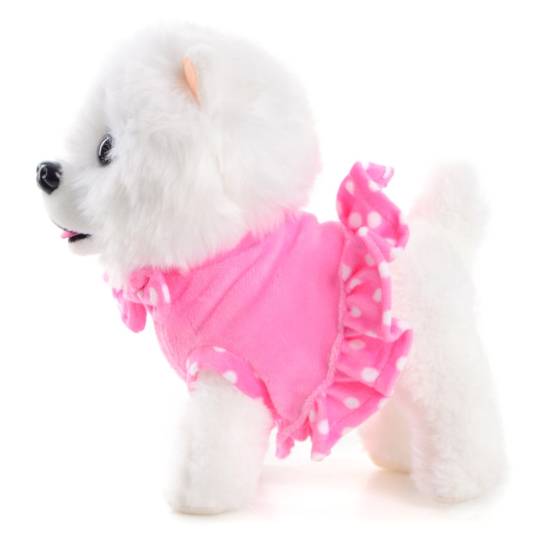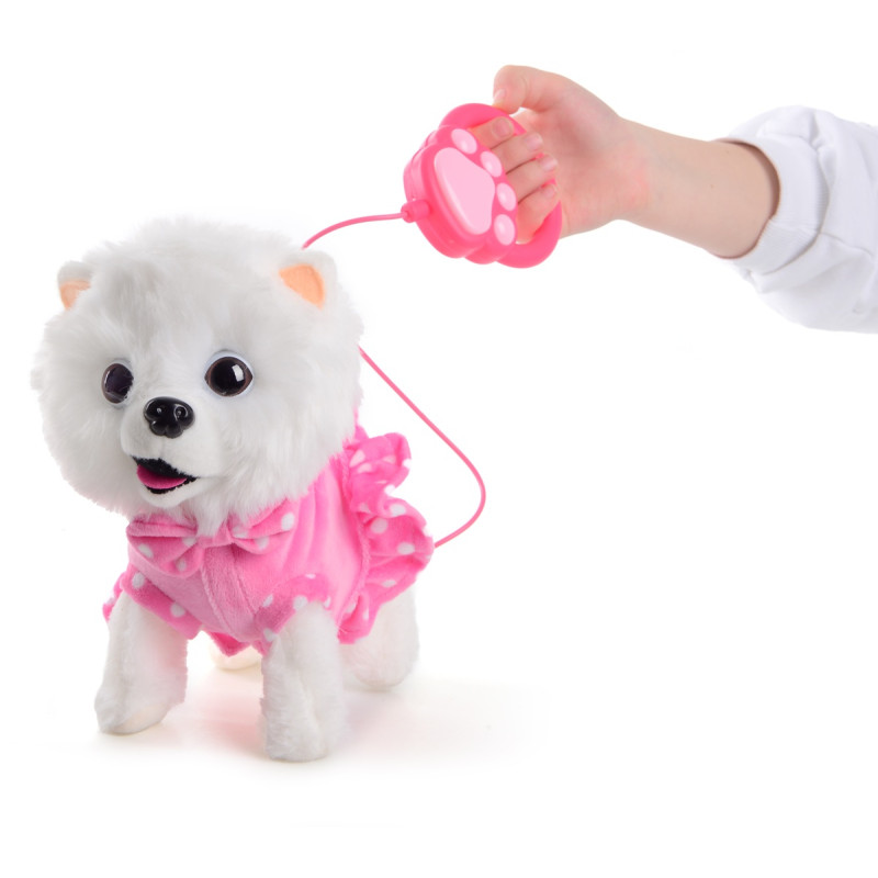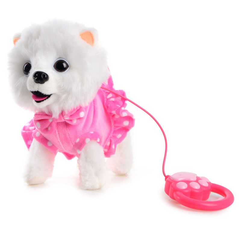 Інтерактивна м'яка іграшка: ходити; гавкає; виляє хвостом, скиглити; реагує на бавовну ладонями та на щук (з від'єднаним повідком). Рекомендований вік: від 3х років. Живлення: 3 батареї типу АА (не входять до комплекту). Матеріал: поліестер, пластик. Розмір іграшки: 23х22х14 см.