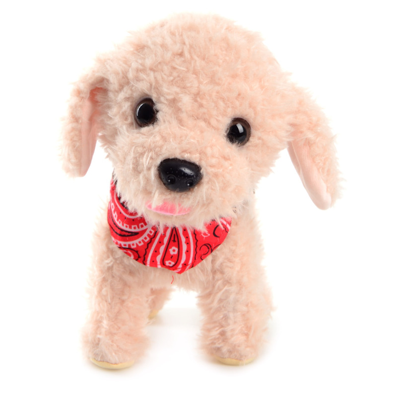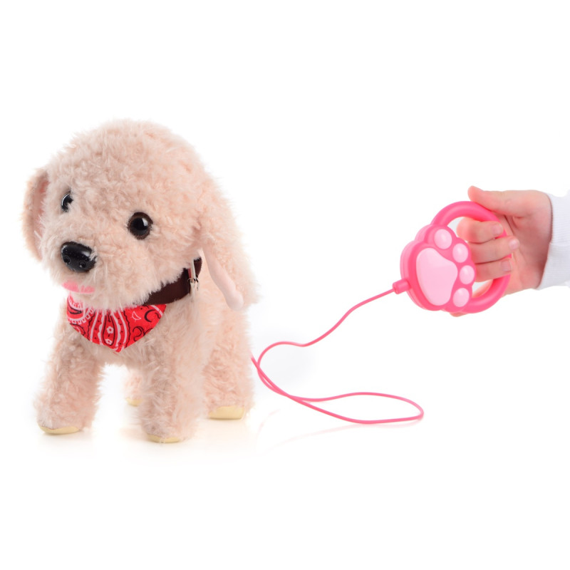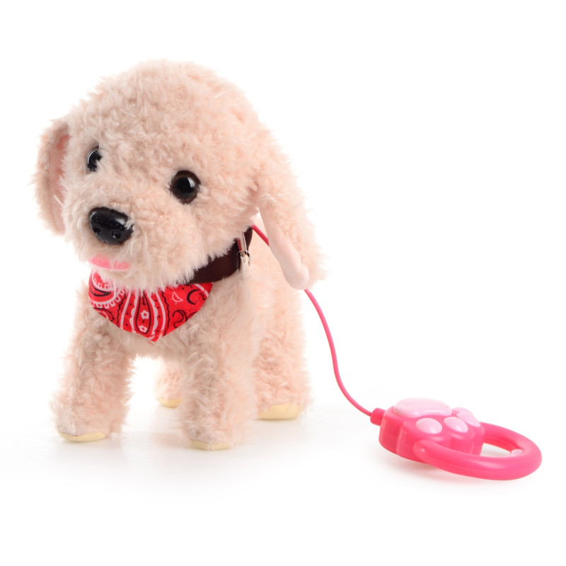 Інтерактивна м'яка іграшка: ходити; гавкає; виляє хвостом, скиглити; реагує на бавовну ладонями та на щук (з від'єднаним повідком). Рекомендований вік: від 3х років. Живлення: 3 батареї типу АА (не входять до комплекту). Матеріал: поліестер, пластик. Розмір іграшки: 22х23х14 см.