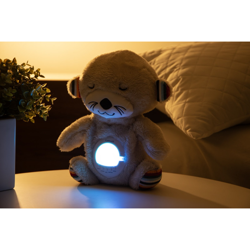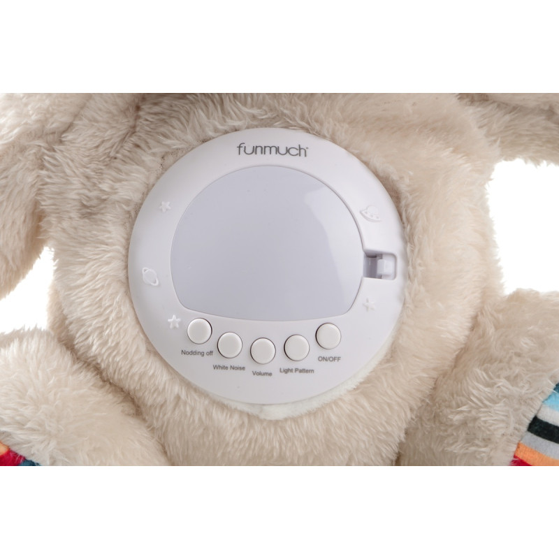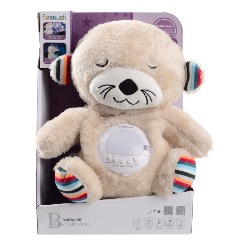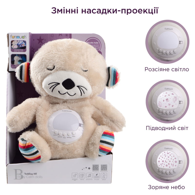 Заспокійлива іграшка-нічник має заспокійливу функцію колисання (колихається вперед і назад), відтворює 60 колискових і 6 білих шумів, має 7 режимів освітлення, три кришки для створення різних ефектів (проекція зоряного неба, проекція океану, нічник). Живлення: 3 батарейки типу АА (не входять до комплекту). Розмір іграшки: 23х16х28 см.