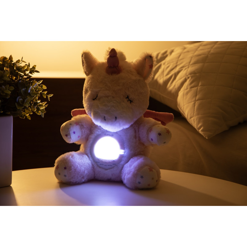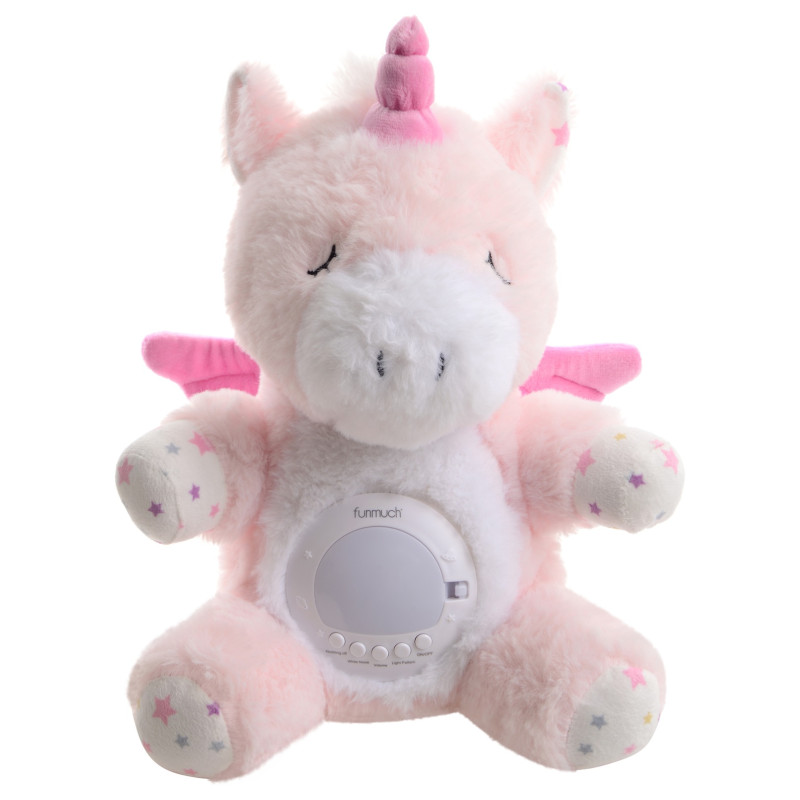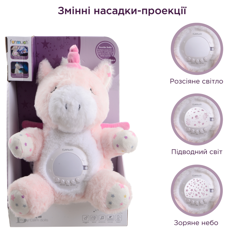 Заспокійлива іграшка-нічник має заспокійливу функцію колисання (колихається вперед і назад), відтворює 60 колискових і 6 білих шумів, має 7 режимів освітлення, три кришки для створення різних ефектів (проекція зоряного неба, проекція океану, нічник). Живлення: 3 батарейки типу АА (не входять до комплекту). Розмір іграшки: 24х24х33 см.