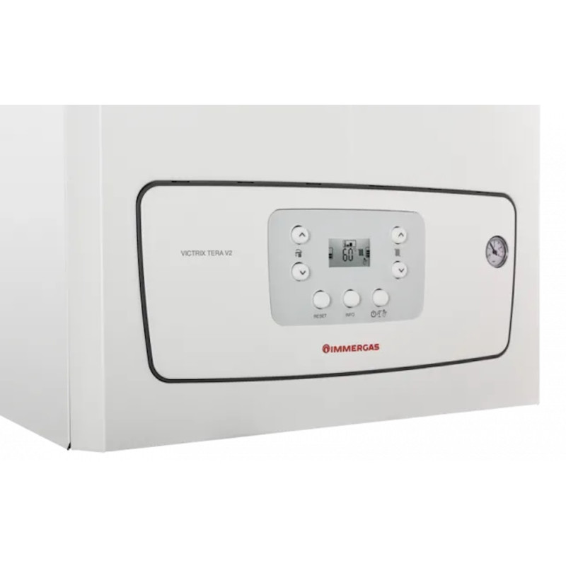 Immergas Victrix Tera V2 32 EU – двоконтурний газовий конденсаційний котел потужністю 32 кВт, створений для ефективного опалення та підготовки гарячої води. Модель поєднує економічність, екологічність та технологічність, підтримуючи роботу з метаном, LPG або сумішшю з 20% водороду. Завдяки компактним розмірам підходить для монтажу у квартирах та приватних будинках. Котел має клас енергоефективності «A» та модуляцію потужності 5–32 кВт для стабільної роботи за різних умов.