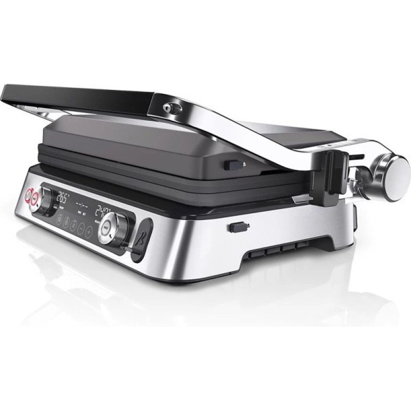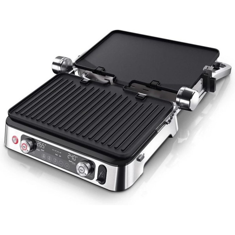 Незалежні електронні термостати дозволяють готувати два види страв при двох різних температурах. У відкритому положенні гриля ви можете готувати м’ясо при високій температурі на одній тарілці, а овочі при нижчій – на іншій. Крім того, ви можете приготувати їжу для 8 осіб на двох великих поверхнях гриля. Так ви зможете організувати смачне застілля для своїх рідних і друзів.