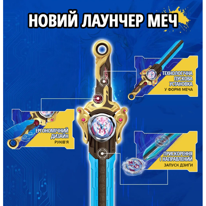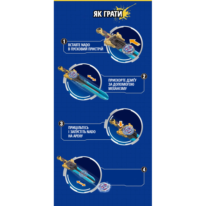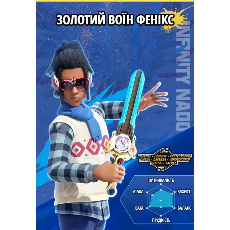 Infinity Nado VI серії Power Pack – дзиґа нового VI покоління зазнала значних вдосконалень, завдяки яким подарує незабутні враження від ще більш видовищних і цікавих поєдинків. Абсолютно нова система запуску дзиґи на арену реалізована за допомогою епічного лаунчера у формі меча, пускова система якого забезпечить контрольований швидкісний старт.