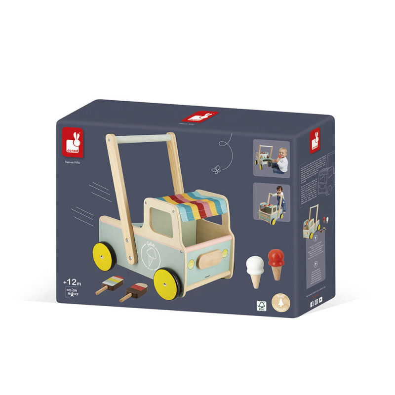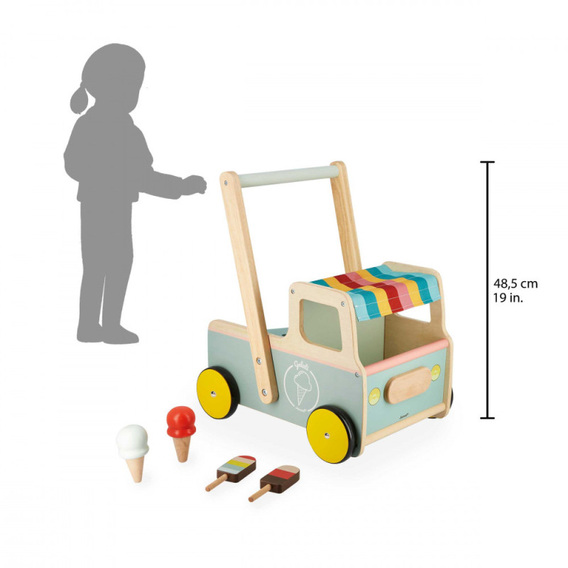 Хто хоче морозива? Полуниця чи ваніль? Конус чи шоколадний лід? Нехай ваш малюк розважиться і зробить свої перші кроки з цим візком 2 в 1: він служить і прогулянковими ходунками, і візком для морозива... що може бути крутішим? Діти від 1 року зможуть пропонувати морозиво протягом дня, це хороший спосіб поспілкуватися та поділитися смачними моментами.