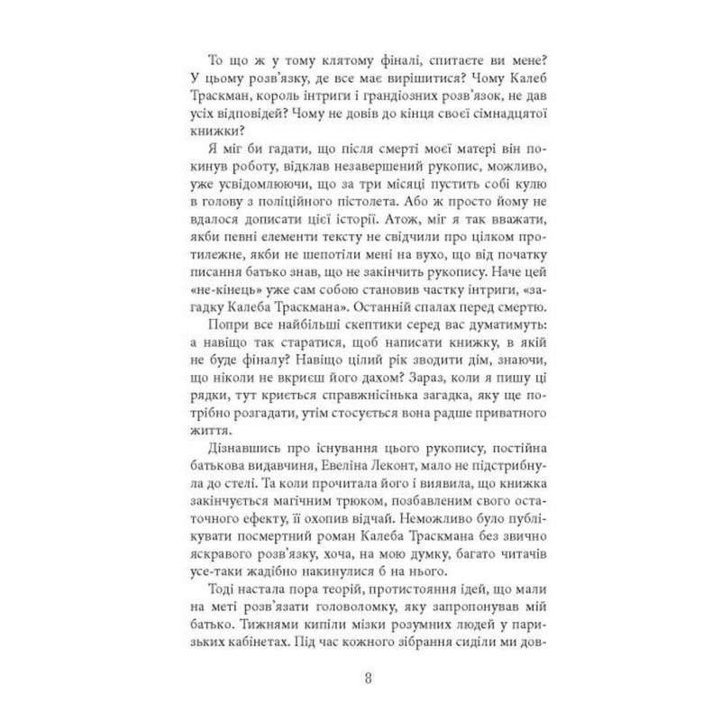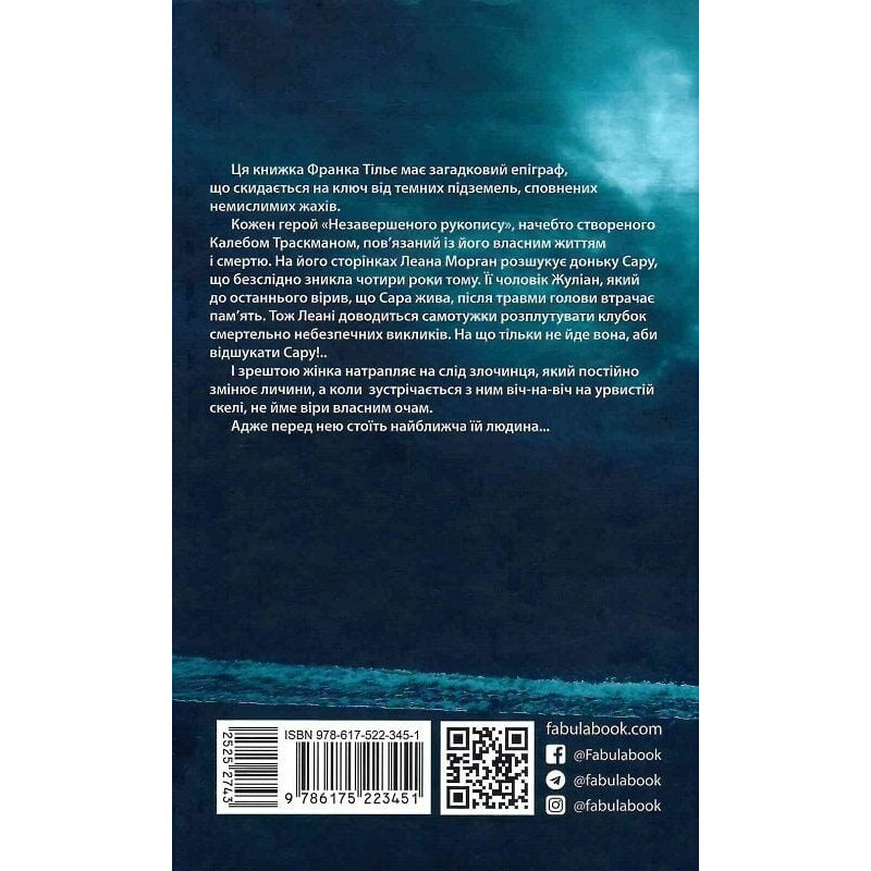 Рукопис без фіналу, труп без обличчя, запитання без відповідей. На околицях Гренобля сталася дорожня аварія: юнак, утікаючи від митників, урізався в балюстраду і загинув. Поліціянти, приїхавши на місце пригоди, виявили в багажнику тіло дівчини. Без обличчя і рук. Тим часом Леана Морган, скромна вчителька, яка стала королевою трилера, через чотири роки після зникнення її дочки, отримує телефонний дзвінок. Її чоловік Жуліан у лікарні з травмою голови: на нього напали. Ба більше, він утратив пам’ять. Він, хто не кидав пошуків і до останнього вірив, що Сара жива. Леані доведеться самотужки розплутувати клубок зловісних загадок.