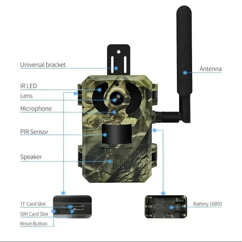 Лісова камера фотоголовки з LTE-модулем та сонячною панеллю також переглядом у реальному часі є інноваційним пристроєм, здатним ефективно спостерігати за навколишнім середовищем та реєструвати рух у віддалених місцях за допомогою передових технологій. Ця камера стане незамінним помічником для мисливців, натуралістів та натуралістів завдяки своїй надійності, компактності та численним перевагам. Переваги фотоголовки містять моментальне пробудження, що дозволяє розпочати запис зображення всього за 0,3 секунд після виявлення руху, що забезпечує оперативну реакцію на події. Завдяки інтелектуальному аналізу зображення (AI IVS), камера здатна точно ідентифікувати об'єкти, що рухаються, включаючи людей. З можливістю спостереження на відстані до 30 метрів у нічний час та виявлення руху на такій самій відстані, камера надає широкий охоплення території та забезпечує чіткі та деталізовані зображення завдяки високій роздільній здатності запису 4MP. Однією з ключових переваг є тривалий час автономної роботи камери, яка може функціонувати в режимі очікування до 12 місяців без заміни батареї. Повідомлення про тривоги надсилаються у безкоштовний додаток для телефону (PUSH) при виявленні руху, забезпечуючи миттєве інформування про події. Крім того, камера дозволяє записувати дані на картку пам'яті або в хмару для збереження та архівації.