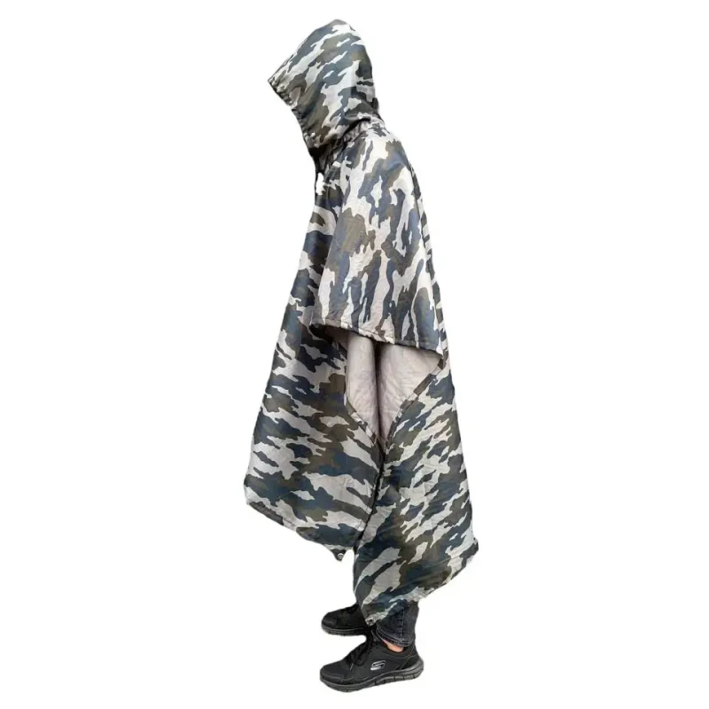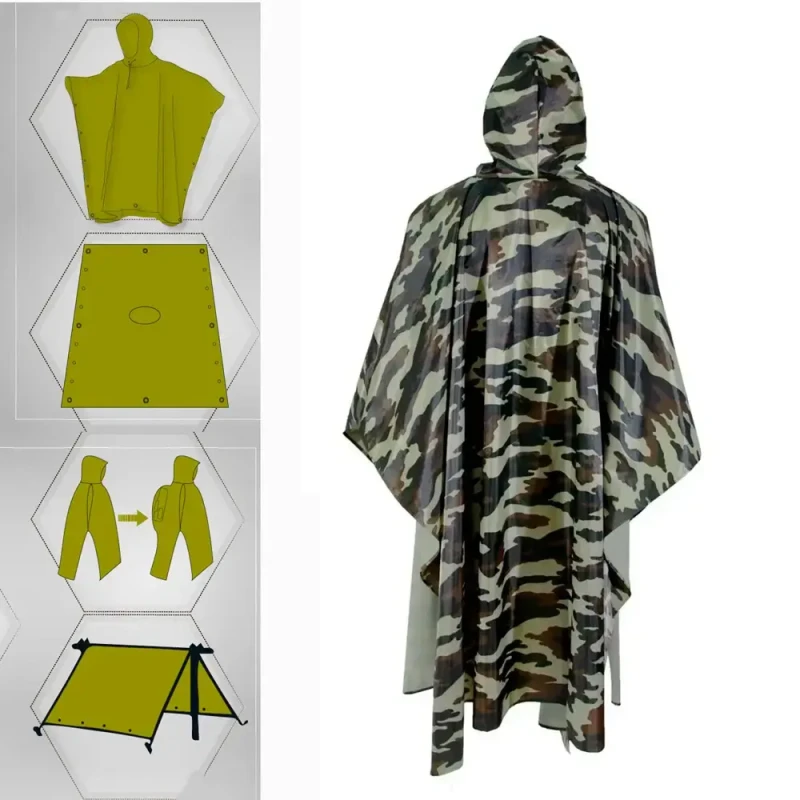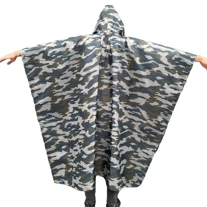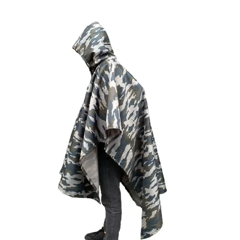 Дощовик – це якісна репродукція американського військового пончо. Вона призначається для захисту людини та її спорядження від сильного холодного вітру, дощу, снігу та іншої негоди. Виріб універсальний, його можна не тільки носити на собі, але й використовувати як тент або навіть одномісний намет. Виробник передбачив також варіант скріплення кількох пончо в одне велике полотно. Остання дія досягається за допомогою спеціальних кнопочок, що знаходяться по краях одягу.