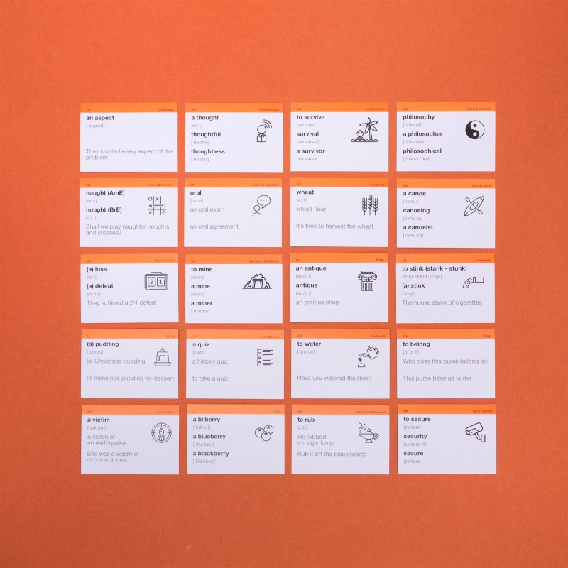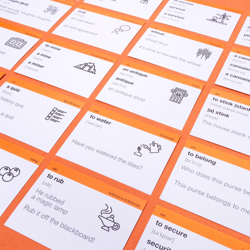 - 500 карток з англійськими словами та прикладами їх вживання (600-700 слів). На кожній картці є слово, транскрипція та приклад його вживання. А також невелике зображення для асоціативного запам’ятовування. На звороті - переклад;