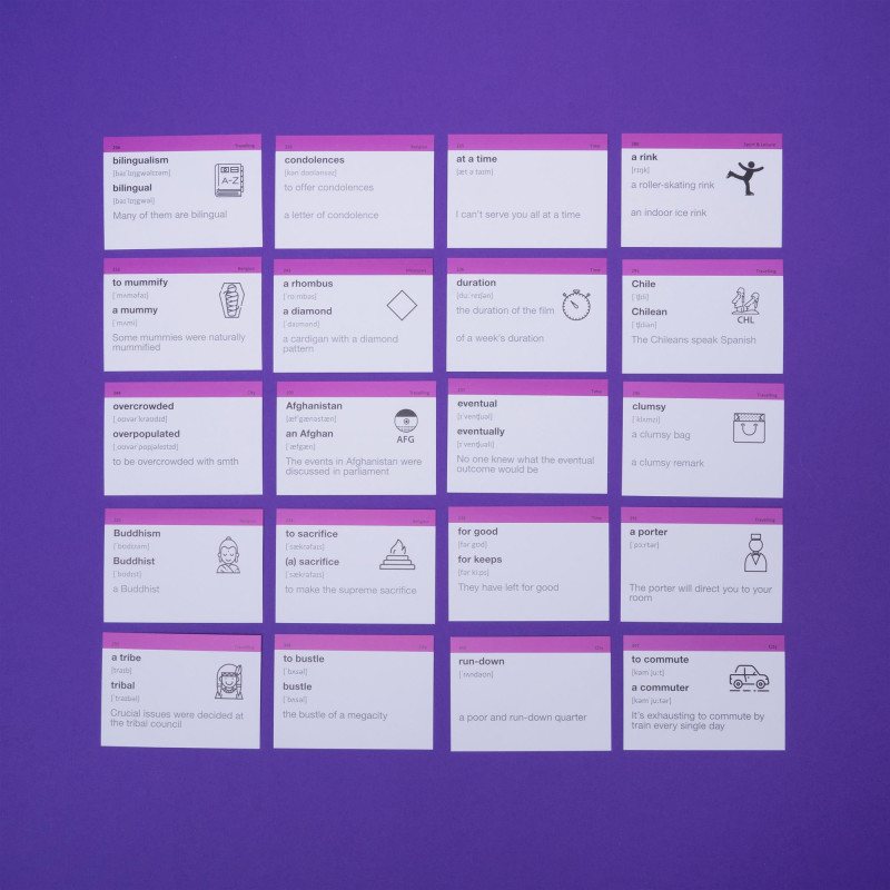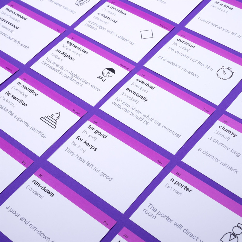 - 500 карток з англійськими словами та прикладами їх вживання (600-700 слів). На кожній картці є слово, транскрипція та приклад його вживання. А також невелике зображення для асоціативного запам’ятовування. На звороті - переклад;