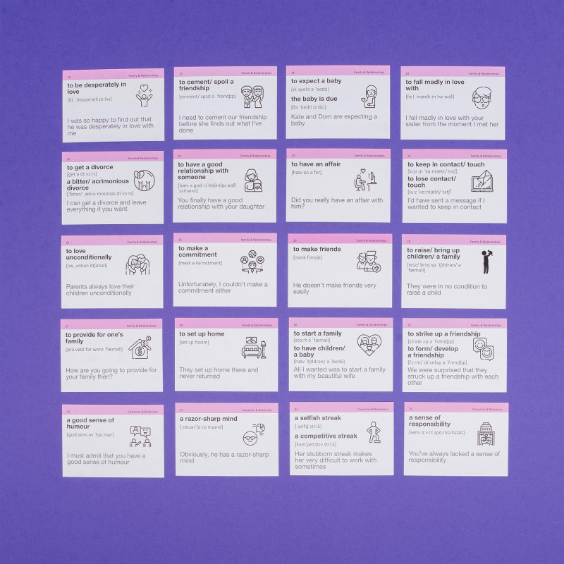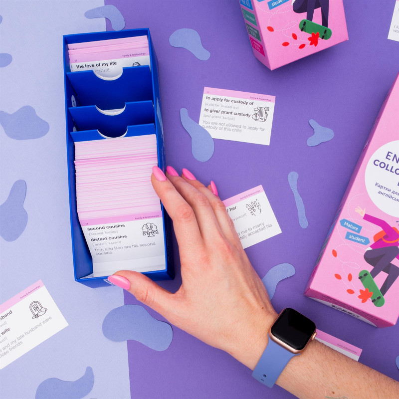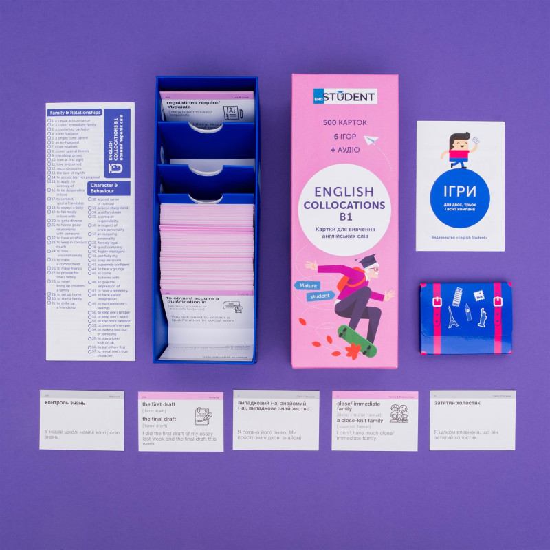 - 1000 карток із англійськими словами та прикладами їх вживання (1200-1400 слів). На кожній картці є слово, транскрипція та приклад його вживання. А також невелике зображення для асоціативного запам’ятовування. На звороті - переклад;