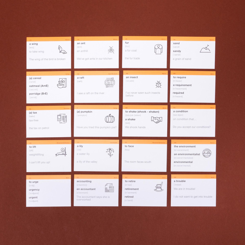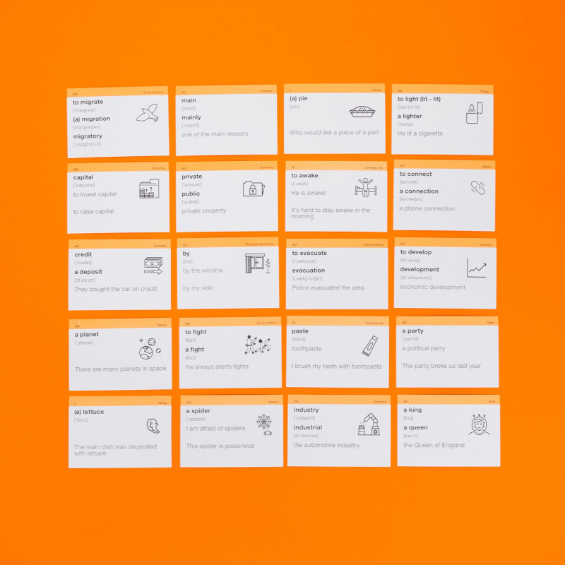 - 1000 карток з англійськими словами та прикладами їх вживання (1200-1400 слів). На кожній картці є слово, транскрипція та приклад його вживання. А також невелике зображення для асоціативного запам’ятовування. На звороті - переклад;