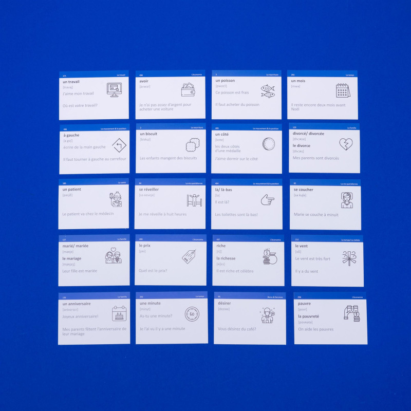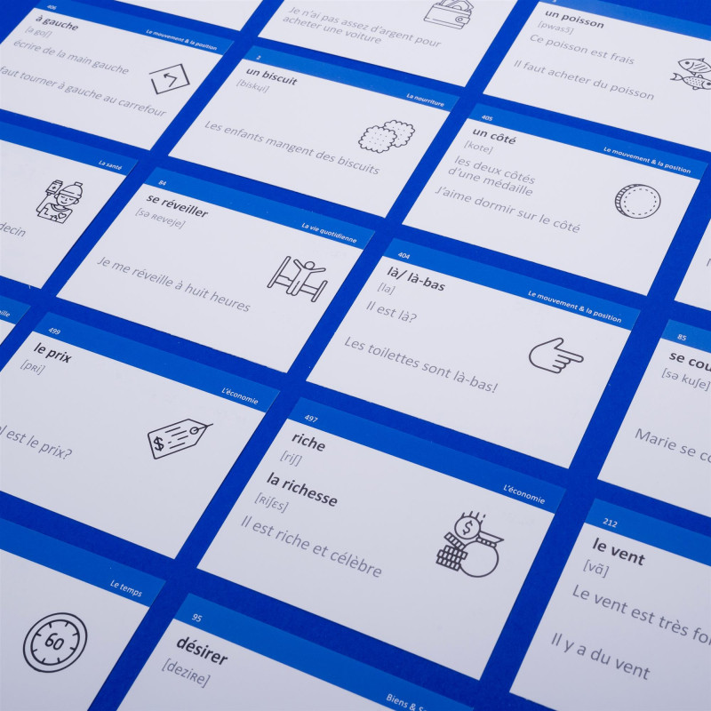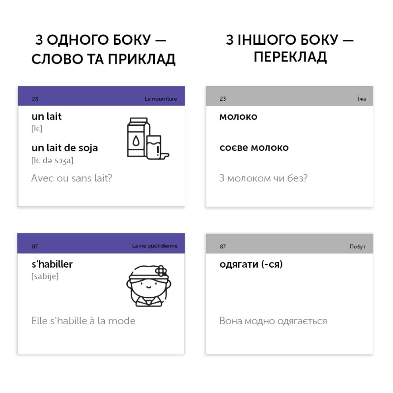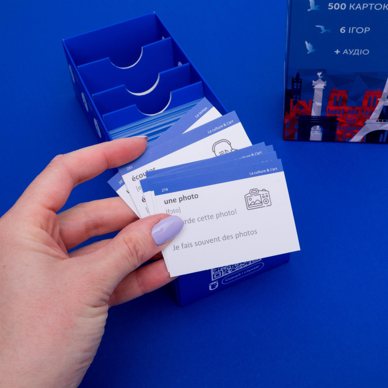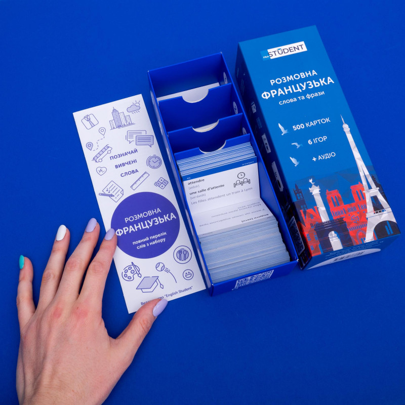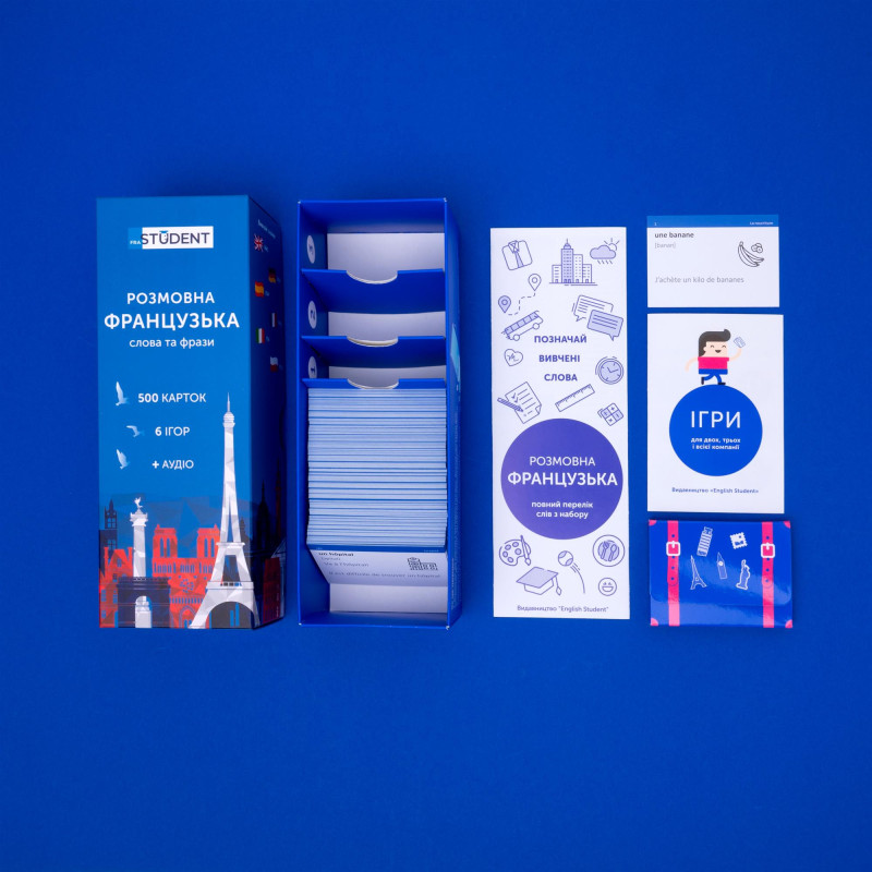 - 500 карток із французькими словами та прикладами їх вживання (600-700 слів). На кожній картці є слово, транскрипція та приклад його вживання. А також невелике зображення для асоціативного запам’ятовування. На звороті - переклад;
