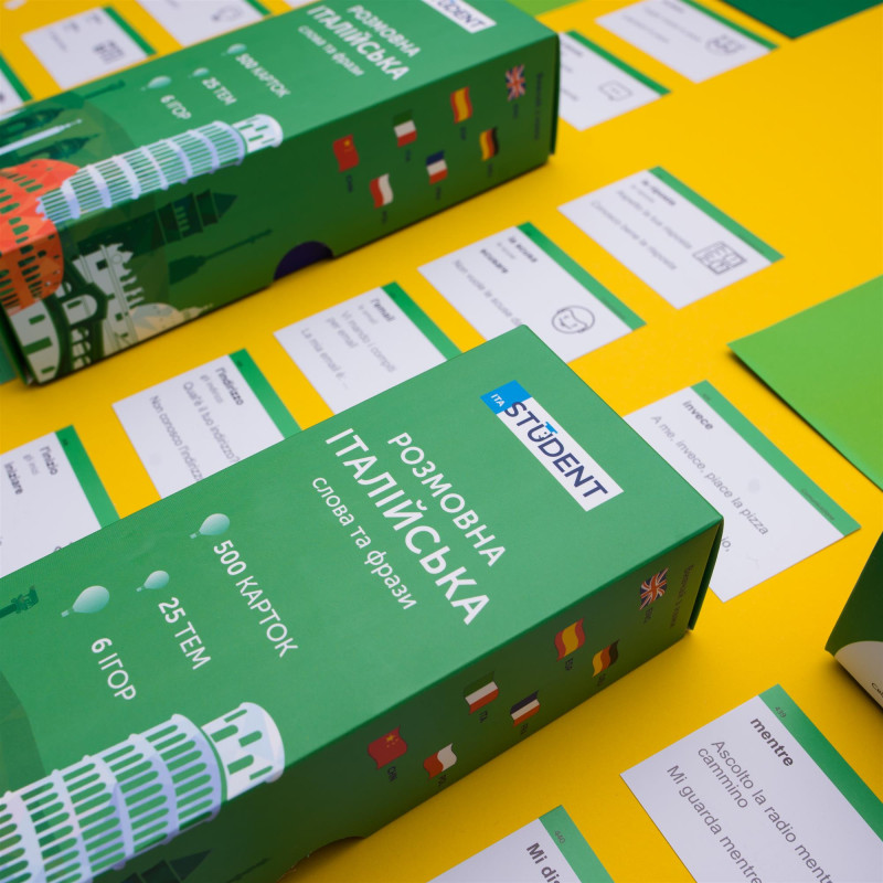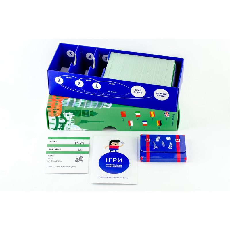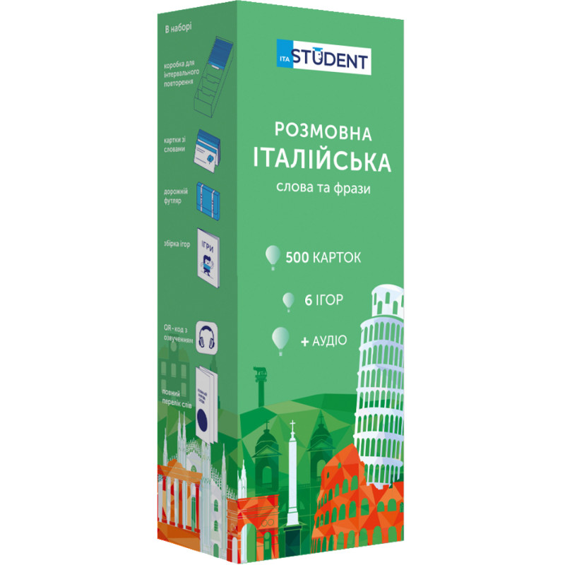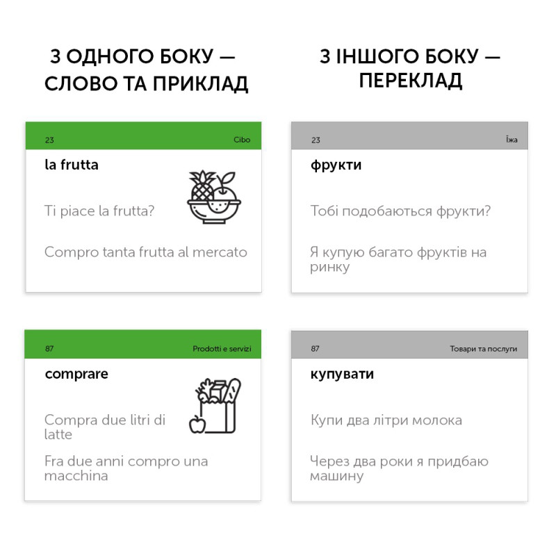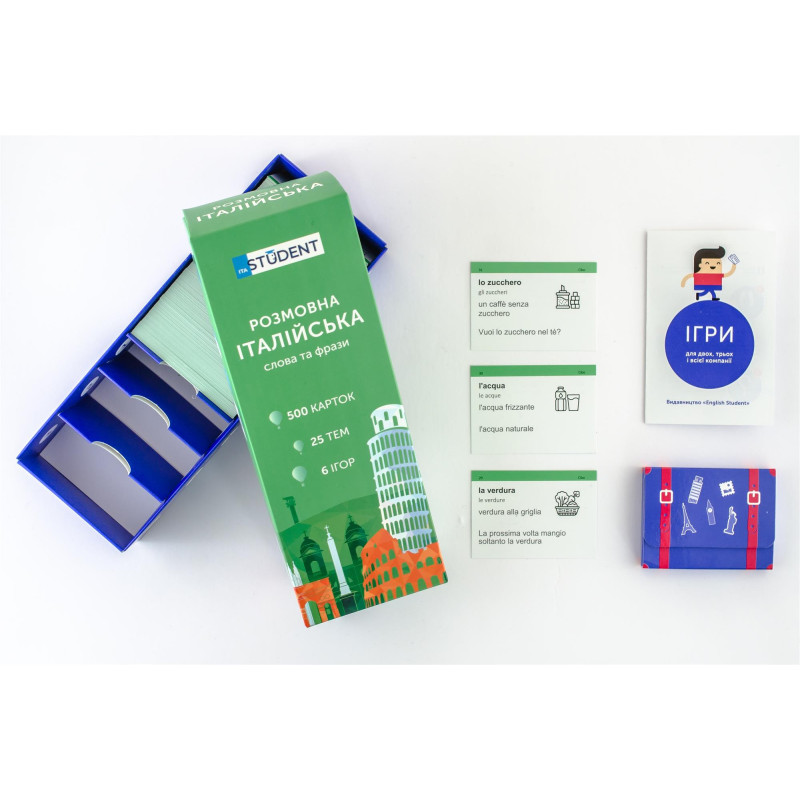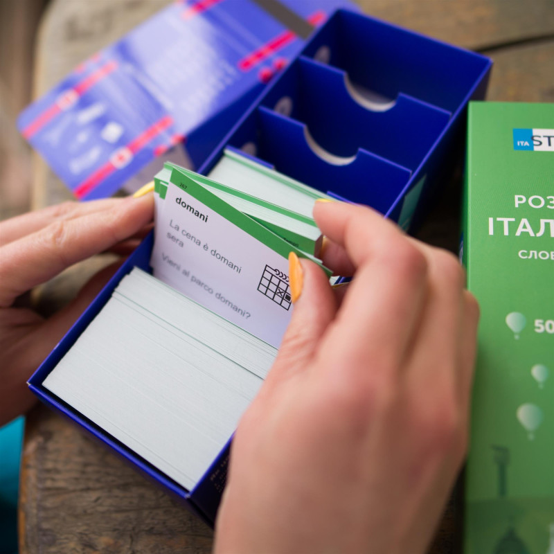 - 500 карток з італійськими словами та прикладами їх вживання (600-700 слів). На кожній картці є слово та приклад його вживання. А також невелике зображення для асоціативного запам’ятовування. На звороті - переклад;